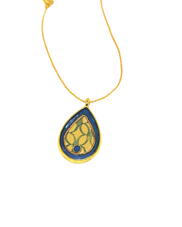 Pendentif mi-long composé de métal doré, de polymère, de résine et d'un cordon doré souple.